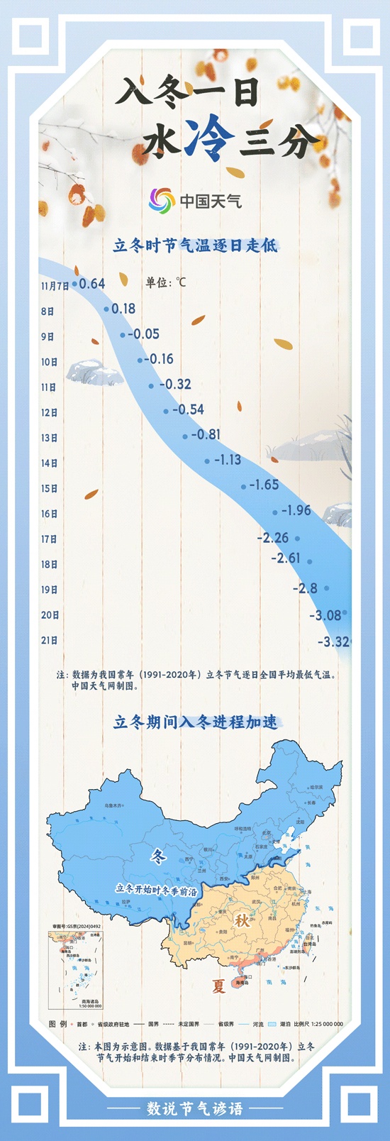 “冬天的第一天,水会变冷。”人们常用这句谚语来形容立冬时天气变冷的情况。整理1991年至2020年气象大资料发现,全国入冬第一天平均最低气温为0.64℃。此后气温逐日下降,日渐寒冷,冬季最后一天降至-3.32℃。