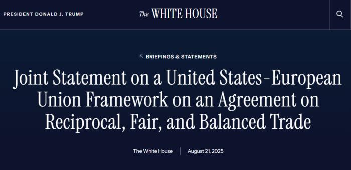 根据中国新闻社Casa Blanca的官方网站,白宫于8月21日在8月21日就当地时间发表了一份声明,即美国和欧盟已经就商业协议框架达成协议。